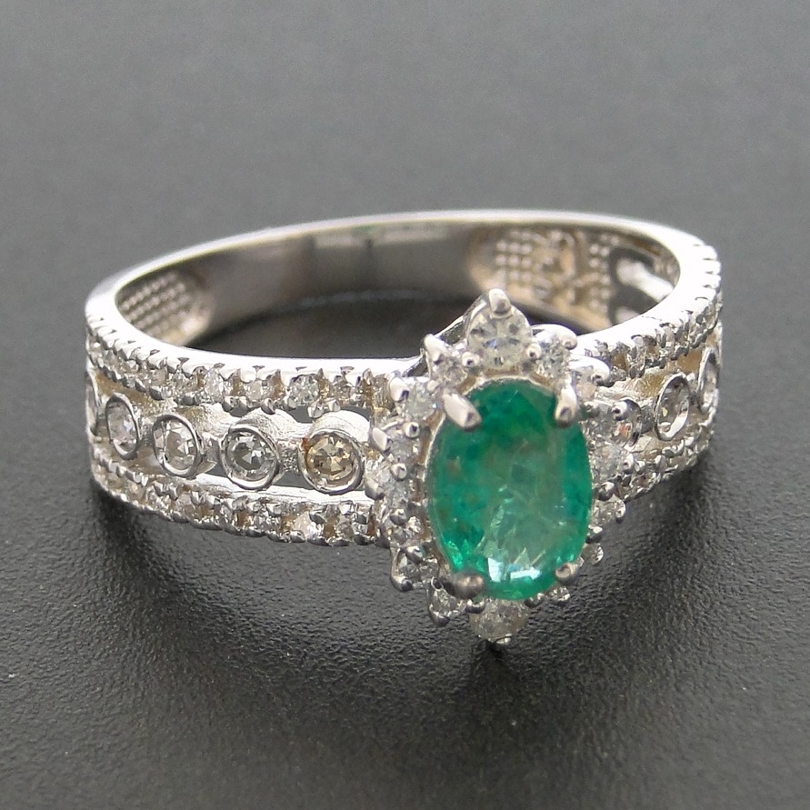 Anel de Ouro Branco com 62 Diamantes e Esmeralda de 80 pts