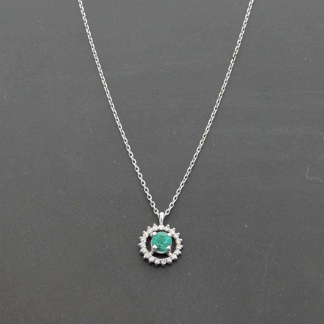 Pingente e Corrente de Ouro Branco com 19 Diamantes e Esmeralda de 25 pts
