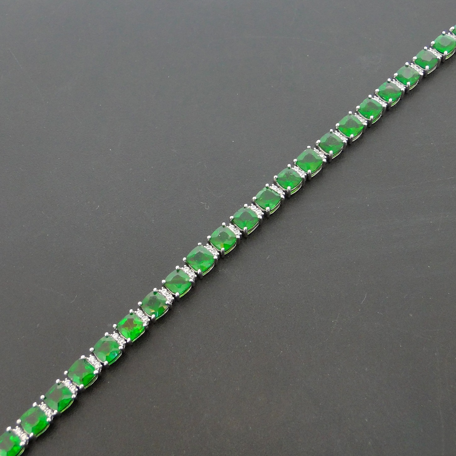 Pulseira de Prata com Cristais e Turmalinas Verdes, com Acabamento em Ródio Peso aproximado: 13,0 gramas Comprimento: 19,5 cm Turmalinas verdes antique de 5X5 mm Cristais Fecho gaveta Prata 925 Acabamento polido